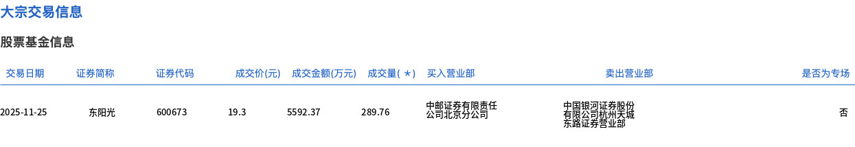 11月25日,东阳光大宗交易成交289.76万股,成交额5592.37万元,占当日总成交额的4.14%,成交价19.3元,较市场收盘价21.9元折价11.87%。